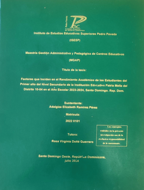 Factores que inciden en el rendimiento académico de los estudiantes del primer año del nivel secundario de la institución educativa Patria Mella del distrito 10-04 en el año escolar 2023-2024, Santo Domingo, Rep. Dom. / Adalgiza Elizabeth Ramírez Pérez ; asesora, Rosa Virginia Doñé Guerrero.
