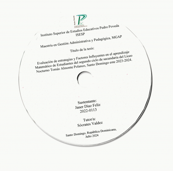 Evaluación de estrategias y factores influyentes en el aprendizaje matemático de estudiantes del segundo ciclo de secundaria del Liceo Nocturno Tomás Almonte Polanco, Santo Domingo Este 2023-2024 / Janer Díaz Feliz ; asesor, Sócrates Valdez.