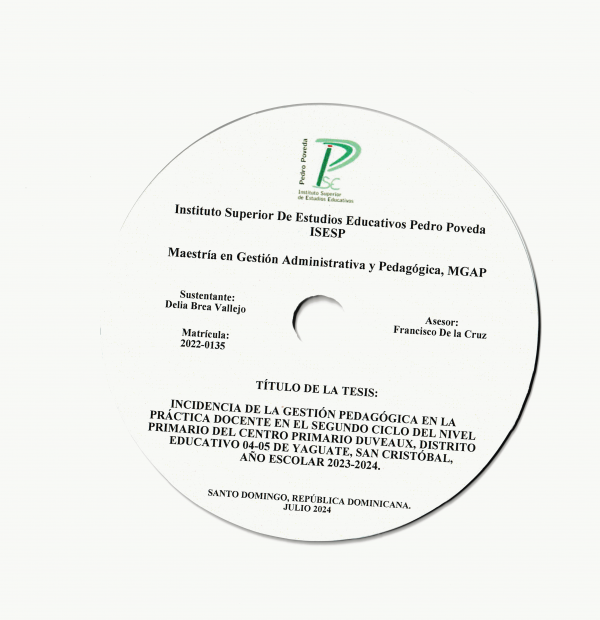 Incidencia de la gestión pedagógica en la práctica docente en el segundo ciclo del nivel primario del Centro Primario Duveaux, distrito educativo 04-05, San Cristóbal, año escolar 2023-2024 / Delia Brea Vallejo ; asesor, Francisco De La Cruz.