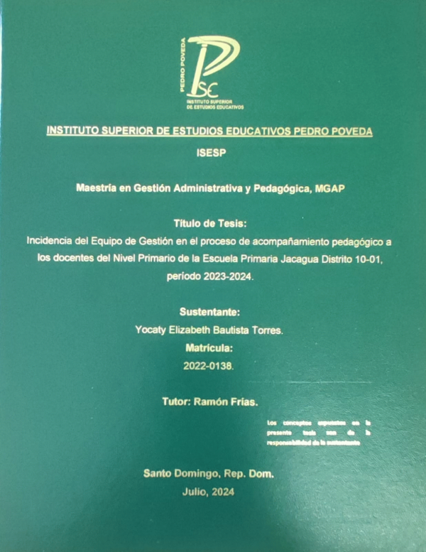 Incidencia del equipo de gestión en el proceso de acompañamiento pedagógico a los docentes del nivel primario de la Escuela Primaria Jacagua distrito 10-01, período 2023-2024 / Yocaty Elizabeth ; asesor, Ramón Frías.