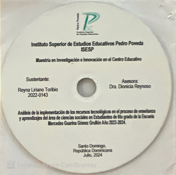 Análisis de la implementación de los recursos tecnológicos en el proceso de enseñanza y aprendizajes del área de ciencias sociales en estudiantes de 6to grado de la escuela Mercedes Guarina Gómez Grullón, año 2023-2024 / Reyna Liriano Toribio ; asesora, Dra. Dionicia Reynoso.