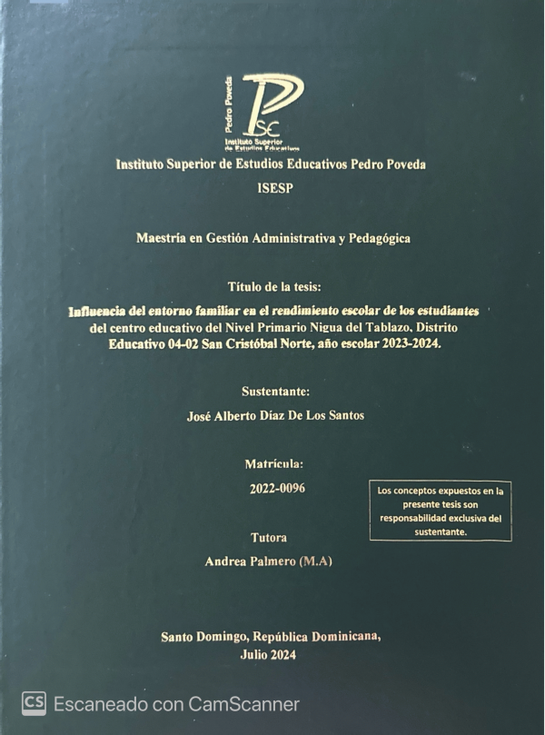 Influencia del entorno familiar en el rendimiento escolar de los estudiantes del Centro Educativo del nivel primario Nigua del Tablazo, Distrito Educativo 04-02 San Cristóbal Norte, año escolar 2023-2024 / Jose Alberto Díaz de los Santo ; asesora, Andrea Palmero.